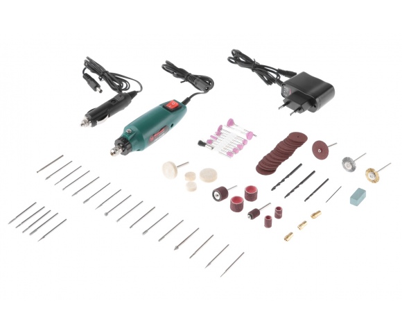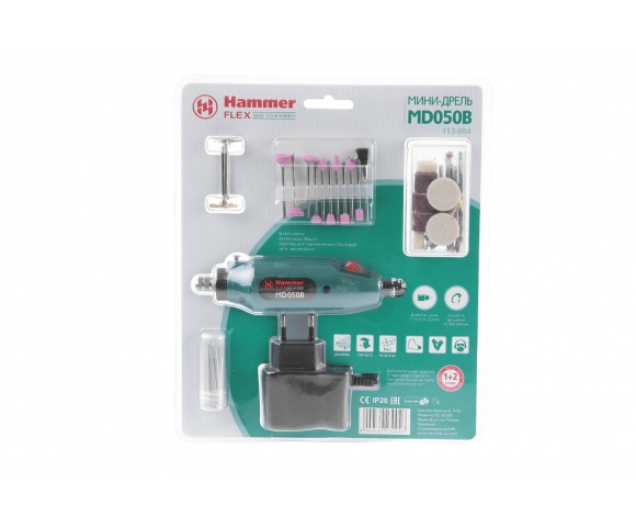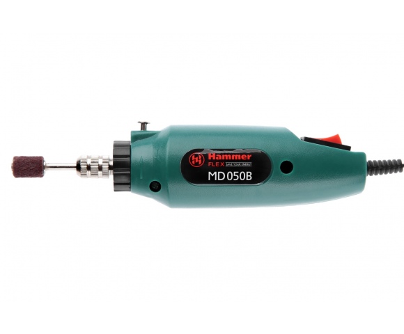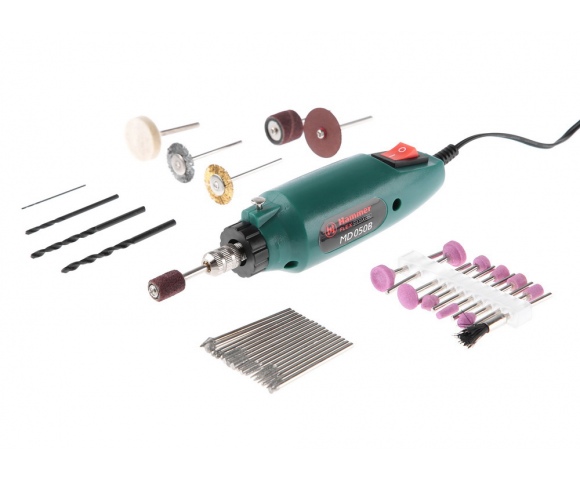 HAMMER MD050B – самая простая мини-дрель в линейке. Поставляется с набором насадок для резки, шлифовки, полировки, сверления, заточки и других работ. Всего в комплекте 80 предметов. Подходит только для периодического домашнего использования.