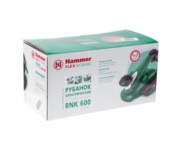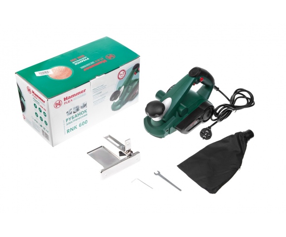 HAMMER RNK600 — компактный и легкий рубанок с плавной регулировкой глубины, эргономичными рукоятками и пылесборником в комплекте. Потребляемая мощность — 600 Ватт, срез толщиной до 2 миллиметров. Преимущества: высокое качество обработки благодаря частоте оборотов 17000 в мин; хранение ключа для смены ножей на корпусе; двухсторонние ножи (2); параллельный упор в комплекте.